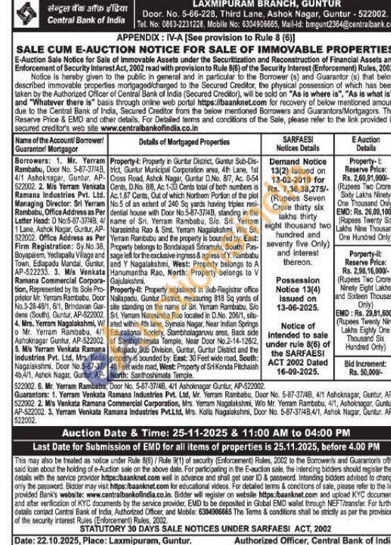 Property-l: Property in Guntur District, Guntur Sub-District, Guntur Municipal Corporation area, 4th Lane, 1st Cross Road, Ashok Nagar, Guntur D.No. 8/7, Ac. 0-54 Cents D.No. 88, Ac. 1-33 Cents total of both numbers is Ac. 1.87 Cents, Out of which Northem Portion of the plot No.5 of an extent of 240 Sq yards having triplex residential house with Door No.5-87-37/48, standing in the 41 name of Sri. Yerram Rambabu, Sio. Sri. Yerram - Narasimha Rao & Smt. Yerram Nagalakshmi, W/o Sri. Per Yerram Rambabu and the property is bounded by: East: . Property belongs to Bondalapali Sriramulu, South: Pas-sage lell for the exclusive ingress & agress of Y. Rambabu , and Y Nagalakshmi, West: Property belongs to A Hanumantha Rao, North: Property belongs to V Gajulakshmi.