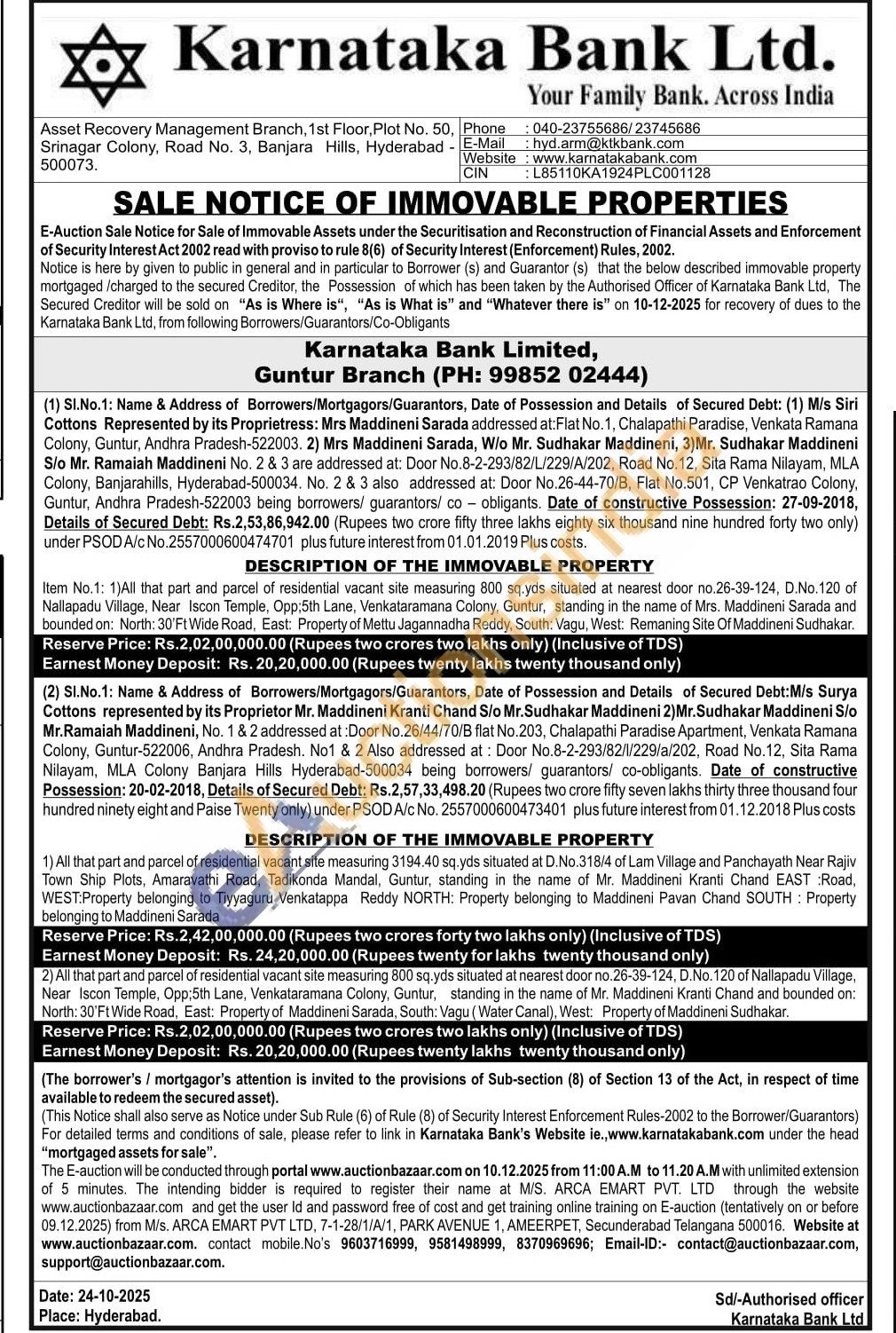 2) All that part and parcel of residential vacant site measuring 800 sq.yds situated at nearest door no.26-39-124, D.No. 120 of Nallapadu Village, Near Iscon Temple, Opp:5th Lane, Venkataramana Colony, Guntur, standing in the name of Mr. Maddineni Kranti Chand and bounded on: North: 30'Ft Wide Road, East: Property of Maddineni Sarada, South: Vagu (Water Canal), West: Property of Maddineni Sudhakar.