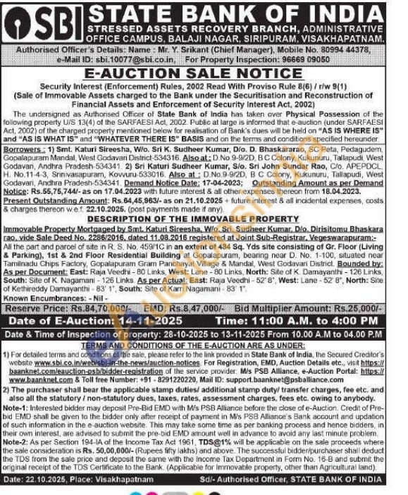 All the part and parcel of site in R. S. No. 459/1C in an extent of 484 Sq. Yds site consisting of Gr. Floor (Living & Parking), 1st & 2nd Floor Residential Building at Gopalapuram, bearing near D. No. 1-100, situated near Tamilnadu Chips Factory, Gopalapuram Gram Panchayal Village & Mandal, West Godavari District. Bounded by: As per Document: East: Raja Veedhi-BO Links, West: Lane-80 Links, North: Site of K. Damayanthi -126 Links, South: Site of K. Nagamani-126 Links As per Actual: East: Raja Veedhi-528, West: Lane-52 8", North: Site of Kethireddy Damayanthi - 83' 1", South: Site of Karri Nagamani-831"