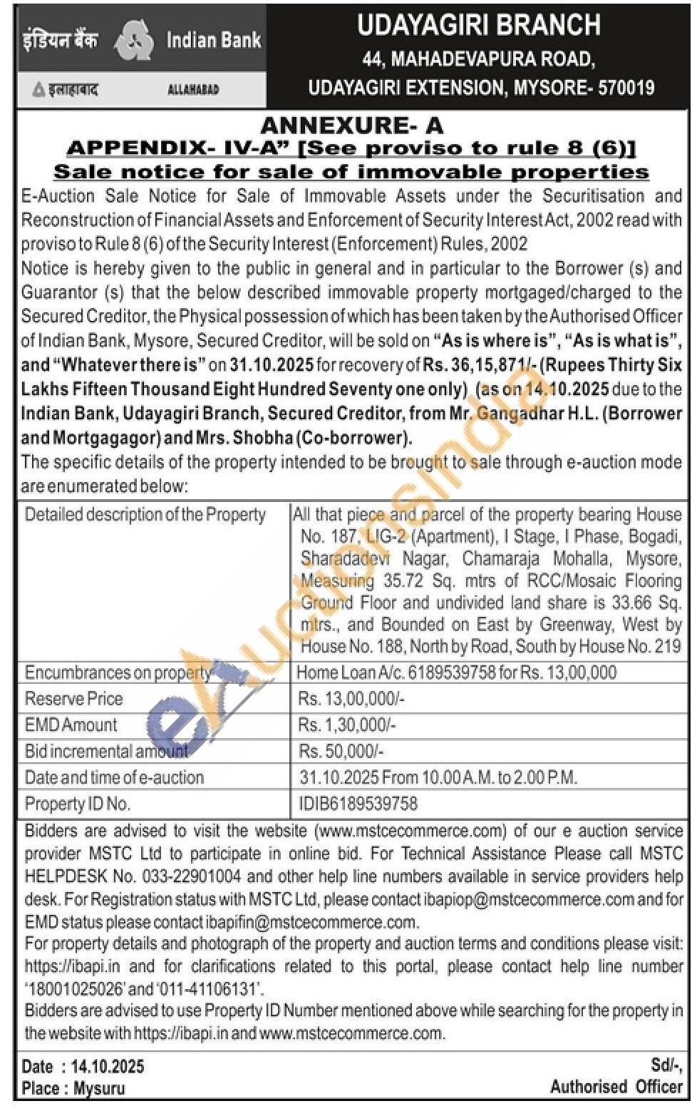 All that piece and parcel of the property bearing House No. 187, LIG-2 (Apartment), I Stage, I Phase, Bogadi, Sharadadevi Nagar, Chamaraja Mohalla, Mysore, Measuring 35.72 Sq. mtrs of RCC/Mosaic Flooring Ground Floor and undivided land share is 33.66 Sq. mtrs., and Bounded on East by Greenway, West by House No. 188, North by Road, South by House No. 219
