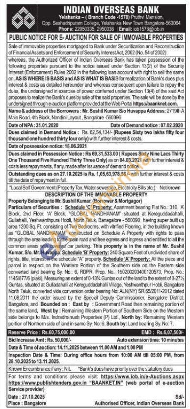 Apartment bearing Flat No: 310, 'A' Block, 2nd Floor, 'A' Block, "GLOBAL NANDHANAM situated at Kereguddadahalli, Gullahalli, Yeshwanthpura Hobli, North Taluk, Banagalore-560090 having super built up area 1200 Sq. Ft. consisting of Two Bedrooms, with vitrified Flooring, in the building known as "GLOBAL NANDHANAM" constructed on Schedule A Property with rights to pass through the area leading to the main road and free egress and ingress and entitled to all the common areas with covered car parking. This property is in the name of Mr. Sushil Kumar, S/o. Mr. Huvappa. Schedule 'B' Property: 240 Square Feet of undivided share of rights, title, interest in the schedule "A" property. Schedule 'A' Property: All the piece and parcel in respect on the Western Portion of the Southern side on the Eastern side converted land beering Sy. No: 6, RDPR. Prop. No.: 150200203400120573, Prop. No.: 1145/877/6 (plaki), Measuring an extent of 0-13% Guntas out of the land to the extent of 0-27% Guntas, situated at Gulladahalli at Kereguddadahalli Village, Yeshwanthpur Hobli, Bangalore North Taluk, converted vide conversion order bearing No: ALN(NY) SR.65/2011-2012 dated 11.08.2011 the order issued by the Special Deputy Commissioner, Bangalore District, Bangalore, and Bounded on: East by: Government Road then remaining portion of the same land, West by: Remaining Western Portion of Southem Side on the Western side belongs to Mis. Indradhanush Properties (P) Ltd., North by: Remaining Western portion of Northern side of land in same Sy. No: 6, South by: Land bearing Sy. No.