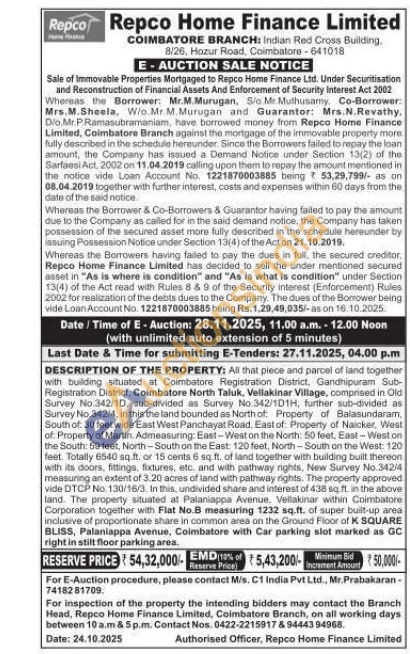 All that piece and parcel of land together with building situated at Coimbatore Registration District, Gandhipuram Sub-Registration District, Coimbatore North Taluk, Vellakinar Village, comprised in Old Survey No.342/10, sub-divided as Survey No 342/101H, further sub-divided as Survey No.342/4, in this the land bounded as North of Property of Balasundaram, South of: 30 feet wide East West Panchayat Road, East of Property of Naicker, West of Property of Martin. Admeasuring: East-West on the North: 50 feet, East-West on the South: 69 feet, North-South on the East: 120 feet, North-South on the West: 120 feet. Totally 6540 sq.ft. or 15 cents 6 sq.ft. of land together with building built thereon with its doors, fittings, fixtures, etc. and with pathway nights, New Survey No. 342/4 measuring an extent of 3.20 acres of land with pathway rights. The property approved vide DTCP No. 130/16/3. In this, undivided share and interest of 438 sq ft in the above land. The property situated at Palaniappa Avenue. Vellakinar within Coimbatore Corporation together with Flat No.B measuring 1232 sq.ft. of super built-up area inclusive of proportionate share in common area on the Ground Floor of K SQUARE BLISS, Palaniappa Avenue, Coimbatore with Car parking slot marked as GC right in stilt floor parking area.