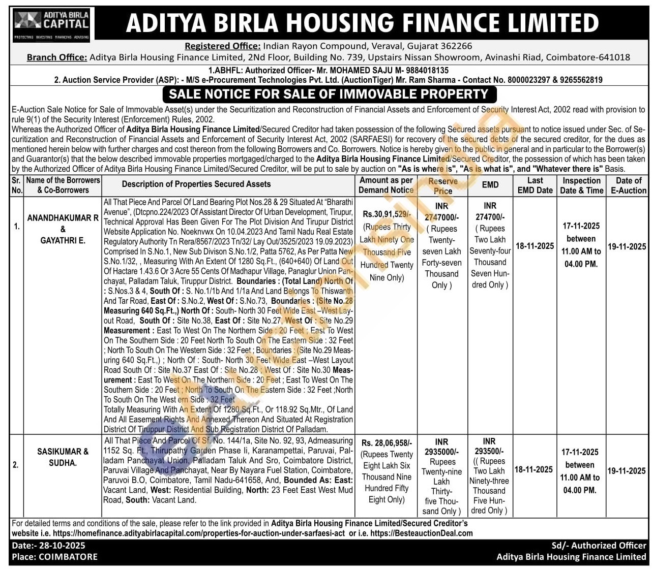 1.ABHFL: Authorized Officer- Mr. MOHAMED SAJU M-9884018135 2. Auction Service Provider (ASP): - M/S e-Procurement Technologies Pvt. Ltd. (AuctionTiger) Mr. Ram Sharma - Contact No. 8000023297 & 9265562819