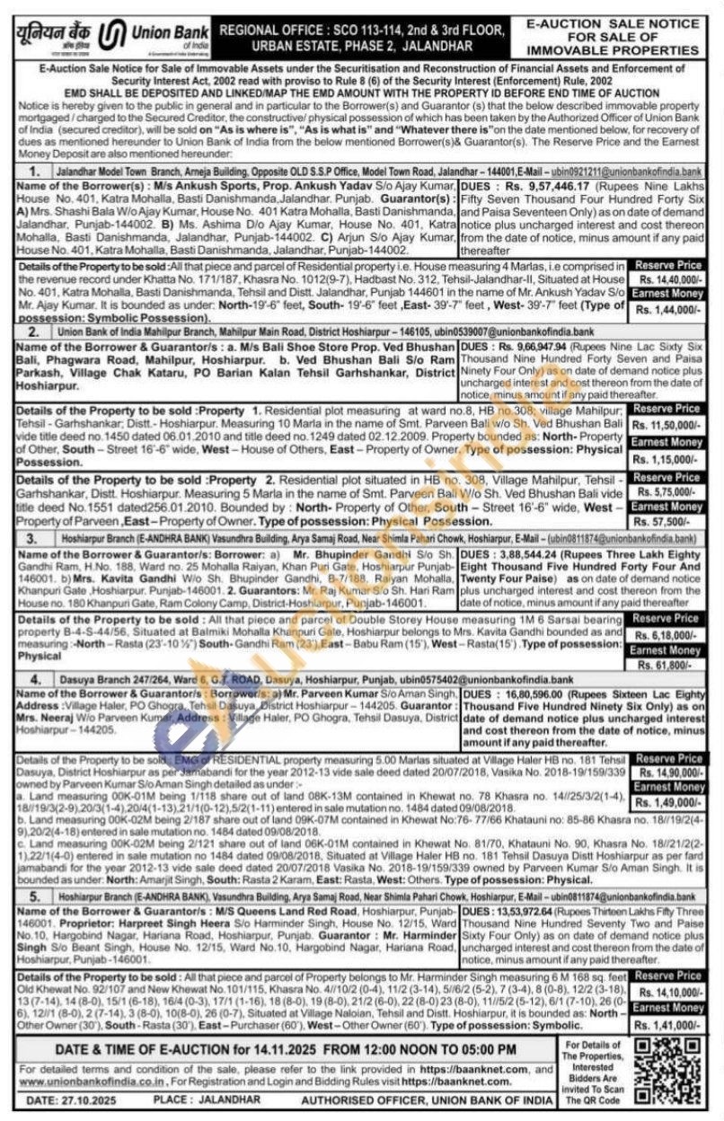 All that piece and parcel of Residential property le. House measuring 4 Marlas, Le comprised in the revenue record under Khatta No. 171/187, Khasra No. 1012(9-7), Hadbast No. 312, Tehsil-Jalandhar-II, Situated at House No. 401, Katra Mohalla, Basti Danishmanda, Tehsil and Distt. Jalandhar, Punjab 144601 in the name of Mr. Ankush Yadav Sio Mr. Ajay Kumar. It is bounded as under: North-19-6" feet, South- 19-6 feet, East-39-7" feet, West-39-7" feet