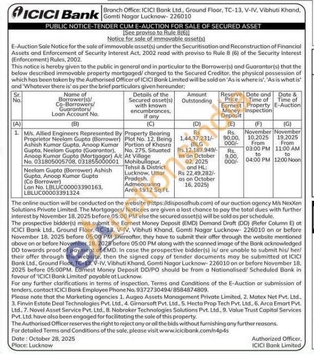 Property Bearing Plot No. 12. Being Portion of Khasra No. 275. Situated At Village Mohibullapur, Tehsil & District Lucknow, Uttar Pradesh. Admeasuring Area 1912 Sq Ft