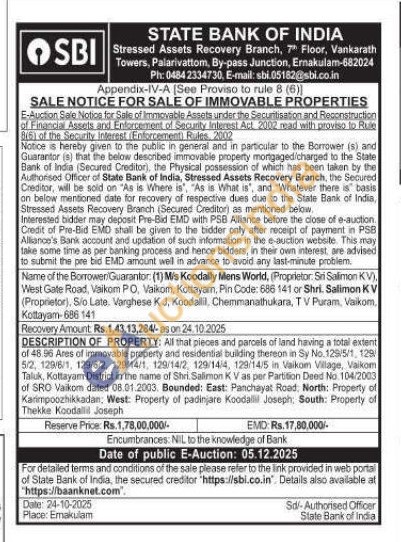 DESCRIPTION OF PROPERTY: All that pieces and parcels of land having a total extent of 48.96 Ares of immovable property and residential building thereon in Sy No. 129/5/1, 129/5/2, 129/6/1, 129/6/2, 129/14/1, 129/14/2, 129/14/4, 129/14/5 in Vaikom Village, Vaikom Taluk, Kottayam District in the name of Shri. Salimon KV as per Partition Deed No. 104/2003 of SRO Vaikom dated 08.01.2003. Bounded: East: Panchayat Road: North: Property of Karimpoozhikkadan, West: Property of padinjare Koodalli Joseph: South: Property of Thekke Koodallil Joseph