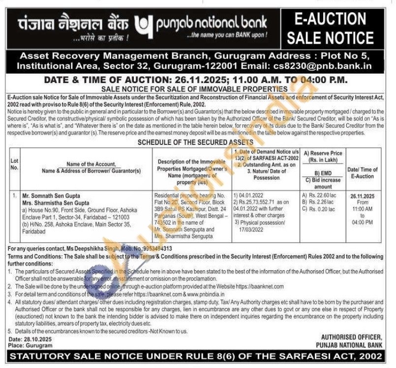 Residential property bearing No. Flat No. 2D, Second Floor, Block 389 Satuli PS Kashipur, Distt. 24 Parganas (South), West Bengal 743502 in the name of Mr. Somnath Sengupta and Mrs. Sharmistha Sengupta