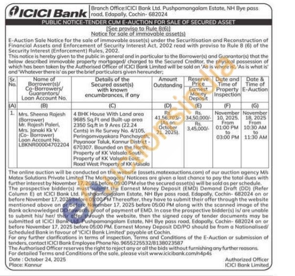 4 BHK House With Land area 9685 Sq.Ft and Built-up area 2350 Sq.ft in 9 Ares (22.24 Cents) in Re Survey No. 4/105, Peringomvayakara Panchayath, Payanoor Taluk, Kannur District-670307. Bounded on the North: Property of KK Valsala South: Property of KK Valsala East: Road West: Property of KK Valsala