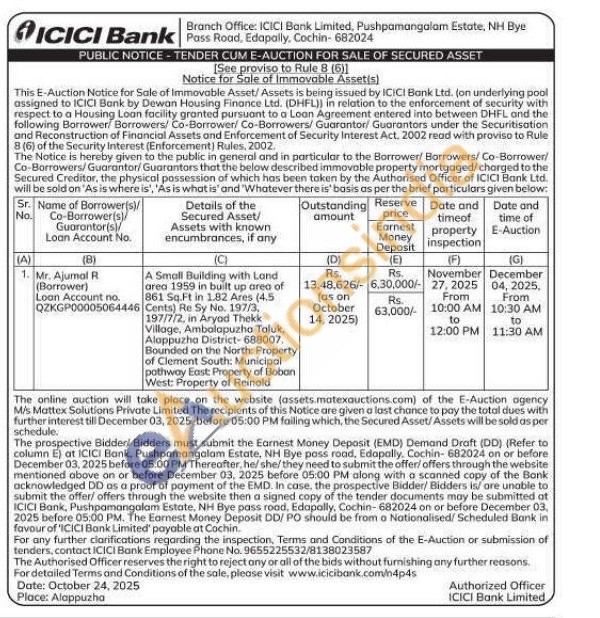 A Small Building with Land area 1959 in built up area of 861 Sq.Ft in 1.82 Ares (4.5 Cents) Re Sy No. 197/3, 197/7/2, in Aryod Thekk Village, Ambalapuzha Taluk, Alappuzha District-688007, Bounded on the North: Property of Clement South: Municipal pothway East: Property of Boban West: Property of Reinold