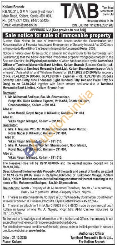 Description of the Immovable Property: All the parts and parcel of land to an extent of 10.10 cents (04.09 ares) in Re.Sy.No.836/5-3-3 of Kilikolloor Village, Kollam Taluk, Kollam District and residential building constructed thereat standing in the name of Mr. Muhammed Sadique, S/o. Mr. Shamsudeen.