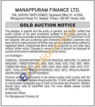 Manappuram Finance Ltd Gold Auctions Auction in Dindigul