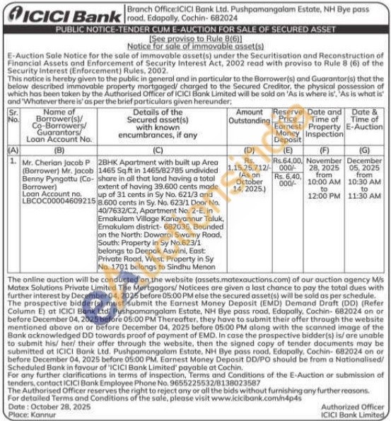 2BHK Apartment with built up Area 1465 Sq.ft in 1465/82785 undivided share in all that land having a totol extent of having 39.600 cents made up of 31 cents in Sy No. 621/3 and 8.600 cents in Sy. No. 623/1 Door No. 40/7632/C2, Apartment No. 2-E, in Ernakulam Village Kanayannur Taluk, Emakulam district-682035, Bounded on the North: Dowarai Swamy Road, South: Property in Sy No.623/1 belongs to Deepak Aswini, East Private Road, West: Property in Sy No. 1701 belongs to Sindhu Menan