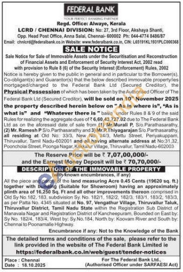 All the piece and parcel of the land measuring Acre 0.45 Cents (19620 sq. ft.) together with building (Suitable for Showroom) having an approximately plinth area of 16,250 Sq. Ft and all other improvements thereon comprised in Old Sy No. 182, 183, subdivision Sy. No. 182/1, 182/2, 182/3, 183/1, 183/2, 183/3, as per Patta No. 4345 situated at No. 97, Vengathur Village, Thiruvallur Taluk, Thiruvallur District, Tamil Nadu State within the Registration Sub District of Manavala Nagar and Registration District of Kancheepuram, Bounded on East by. Sy No. 182/4, 183/4, West by: Sy. No. 184. 184, North by: Koovam River and South by: Chennai to Poonamalle Highway.