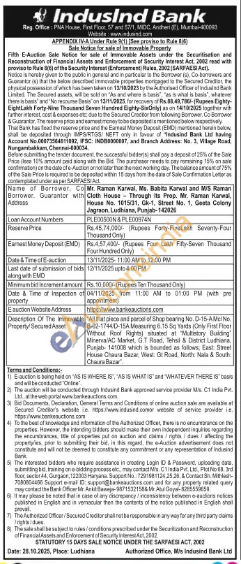All that piece and parcel of Shop bearing No. D-15-AMcl No. B-02-1744/D-15A Measuring 6.15 Sq Yards (Only First Floor Without Roof Rights) situated at "Multistory Building" Minerva/AC Market, G.T Road, Tehsil & District Ludhiana, Punjab- 141008 which is bounded as follows; East: Street House Chaura Bazar, West: Gt Road, North: Nala & South Chaura Bazar