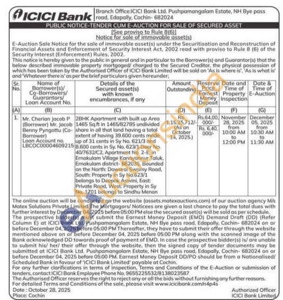 2BHK Apartment with built up Area 1465 Sqft in 1465/82785 undivided share in all that land having a total extent of having 39.600 cents mode up of 31 cents in Sy No. 621/3 and 8.600 cents in Sy. No. 623/1 Door No. 40/7632/C2, Apartment No. 2-E, in Emakulam Village Kanayannur Taluk, Emakulam district- 682035, Bounded on the North: Dowarai Swamy Road, South: Property in Sy No.623/1 belongs to Deepak Aswini, East Private Road, West: Property in Sy No. 1701 belongs to Sindhu Menon