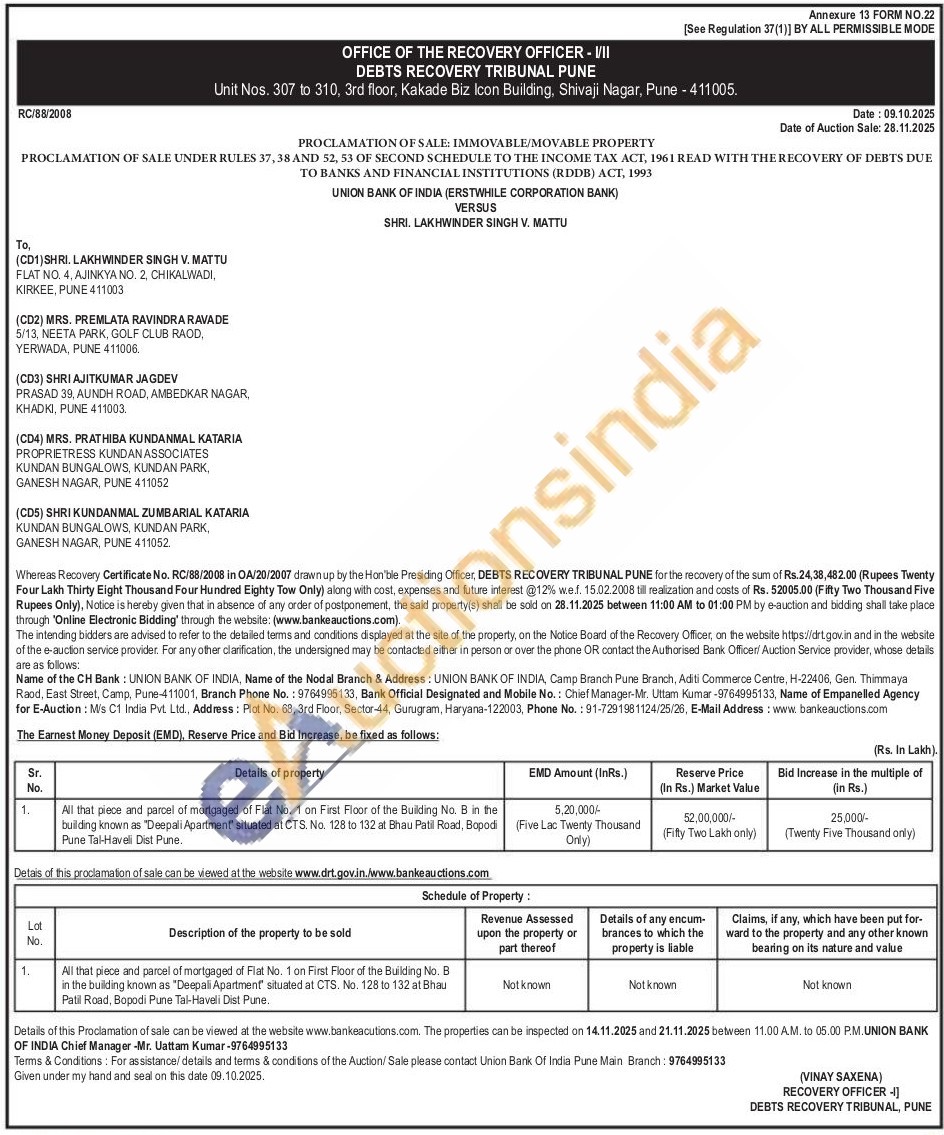 All that piece and parcel of mortgaged of Flat No. 1 on First Floor of the Building No. 8 in the building known as "Deepali Apartment situated at CTS. No, 128 to 132 at Bhau Patil Road, Bopodi Pune Tal-Haveli Dist Pune.