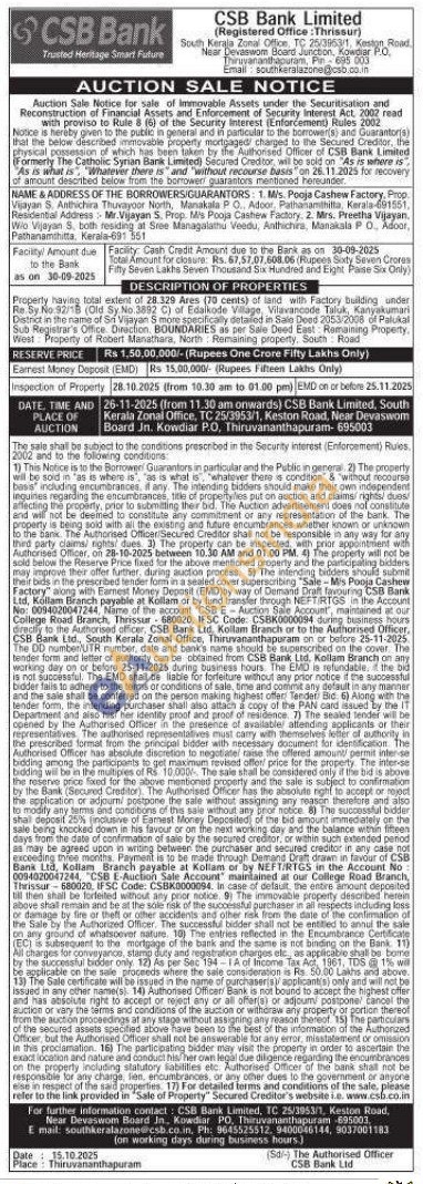 Property having total extent of 28.329 Ares (70 cents) of land with Factory building under Re. Sy No 92/18 (Old Sy. No.3892 C) of Edalkode Village, Vilavancode Taluk, Kanyakumari District in the name of Si ame of Sin Vijayan Sm S more specifically detailed in detailed in Sale Deed 2053/2008 of Palukal Sub Registrar's Office Direction, BOUNDARIES as per Sale Deed East: Remaining Property, West: Property of Robert Manathara, North Remaining property, South Road