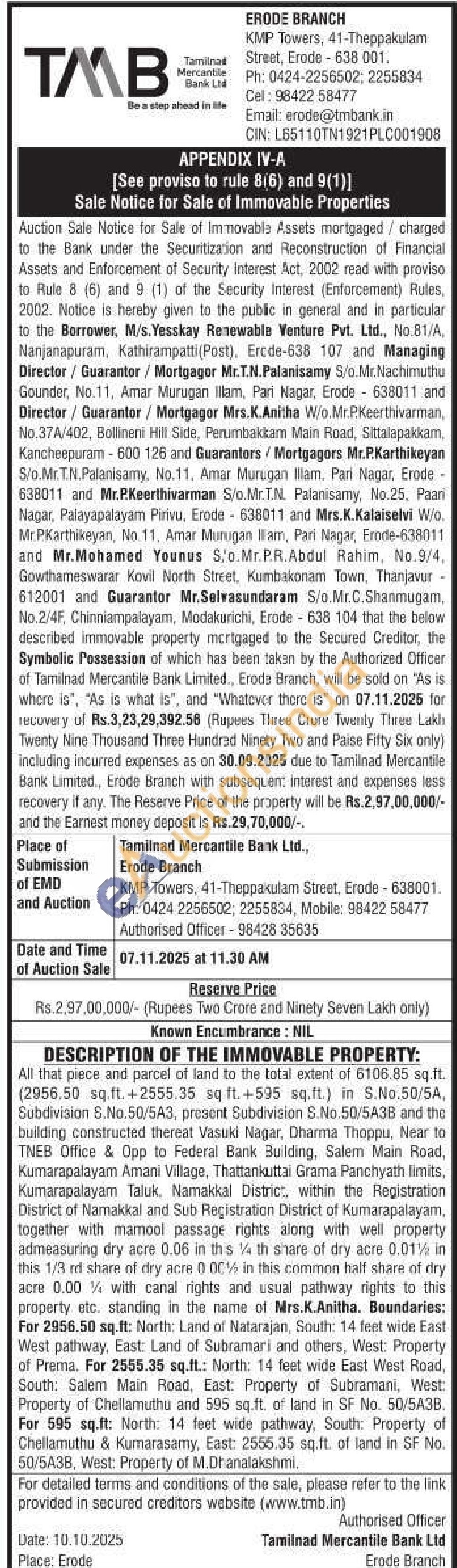 All that piece and parcel of land to the total extent of 6106.85 sq.ft. (2956.50 sq.ft. +2555.35 sq.ft.+595 sq.ft.) in S.No.50/5A, Subdivision S.No.50/5A3, present Subdivision S.No.50/5A3B and the building constructed thereat Vasuki Nagar, Dharma Thoppu, Near to TNEB Office & Opp to Federal Bank Building, Salem Main Road, Kumarapalayam Amani Village, Thattankuttai Grama Panchyath limits, Kumarapalayam Taluk, Namakkal District, within the Registration District of Namakkal and Sub Registration District of Kumarapalayam, together with mamool passage rights along with well property admeasuring dry acre 0.06 in this 4 th share of dry acre 0.01% in this 1/3 rd share of dry acre 0.00% in this common half share of dry acre 0.00% with canal rights and usual pathway rights to this property etc. standing in the name of Mrs.K.Anitha. Boundaries: For 2956.50 sq.ft: North: Land of Natarajan, South: 14 feet wide East West pathway, East: Land of Subramani and others, West: Property of Prema. For 2555.35 sq.ft.: North: 14 feet wide East West Road, South: Salem Main Road, East: Property of Subramani, West: Property of Chellamuthu and 595 sq.ft. of land in SF No. 50/5A3B. For 595 sq.ft: North: 14 feet wide pathway, South: Property of Chellamuthu & Kumarasamy, East: 2555.35 sq.ft. of land in SF No. 50/5A3B, West: Property of M.Dhanalakshmi.