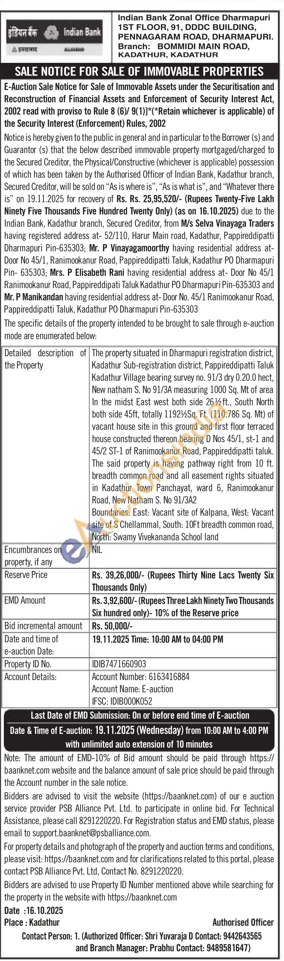 The property situated in Dharmapuri registration district, Kadathur Sub-registration district, Pappireddipatti Taluk Kadathur Village bearing survey no. 91/3 dry 0.20.0 hect, New natham S. No 91/3A measuring 1000 Sq. Mt of area In the midst East west both side 26½ft., South North both side 45ft, totally 11922Sq. Ft. (110.786 Sq. Mt) of vacant house site in this ground and first floor terraced house constructed thereon bearing D Nos 45/1, st-1 and 45/2 ST-1 of Ranimookanur Road, Pappireddipatti taluk.The said property is having pathway right from 10 ft. breadth common road and all easement rights situated in Kadathur Town Panchayat, ward 6, Ranimookanur Road, New Natham S. No 91/3A2 Boundaries: East: Vacant site of Kalpana, West: Vacant site of S Chellammal, South: 10Ft breadth common road, North: Swamy Vivekananda School land
