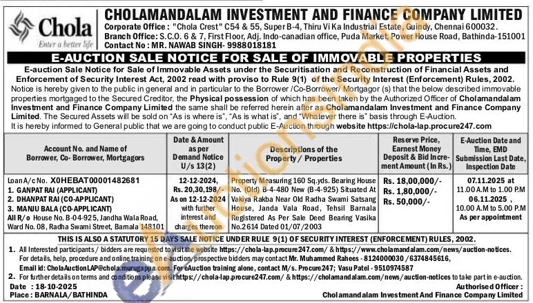 Property Measuring 160 Sq.yds. Bearing House No. (Old) B-4-480 New (B-4-925) Situated At Vakiya Rakba Near Old Radha Swami Satsang House, Janda Vala Road, Tehsil Barnala Registered As Per Sale Deed Bearing Vasika No.2614 Dated 01/07/2003