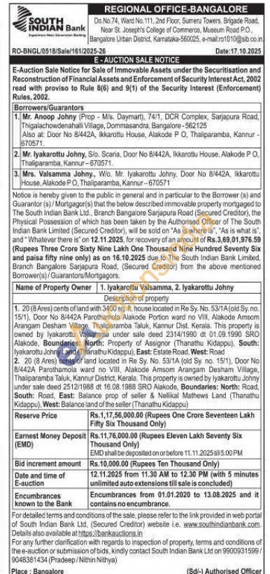 1. 20 (8 Ares) cents of land with 3400 sq. ft. house located in Re Sy. No. 53/1A (old Sy, no. 15/1), Door No 8/442A Parothamola Alakode Portion ward no VIII, Alakode Amsom Arangam Desham Village, Thaliparamba Taluk, Kannur Dist. Kerala. This property is owned by lyakarottu Valsamma under sale deed 2314/1990 dt 01.09.1990 SRO Alakode, Boundaries: North: Property of Assignor (Thanathu Kidappu), South: lyakarottu Johny Land (Thanathu Kidappu), East: Estate Road, West: Road 2. 20 (8 Ares) cents of land located in Re Sy. No. 53/1A (old Sy. no. 15/1), Door No 8/442A Parothamola ward no VIII, Alakode Amsom Arangam Desham Village, Thaliparamba Taluk, Kannur District, Kerala, This property is owned by lyakarottu Johny under sale deed 2512/1988 of 16.08.1988 SRO Alakode, Boundaries: North: Road, South: Road, East: Balance prop of seiler & Nellikal Mathews Land (Thanathu Kidappu), West: Balance land of the seller (Thanathu Kidappu)
