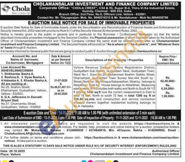 Vellore Revenue District, Vellore Registration District. Gudiyattam Sub District, Gudiyattam Taluk, Gudiyattam Town, Ward No.1, Door No.25. Mohammed Ibrahim Saibhu Street Dharnampet, Gudiyattam Town Survey Nos 444 South by: Street, North by: Big Mosque Kabarasthan, West by: belongs to Abdulkhan, East by: House belongs to Akbarkhan, Measuring east to west 16 ft (includes both walls) and North to South 64 1/2 ft totaling 1440 sq.ft now the correct measurement is East to west 18 feet, North to south 72 feet, in total 1296 sq. ft or 120.40 sq.mts and construction and service connection situated therein together residential building belongs to Mr. A. Habeeba.