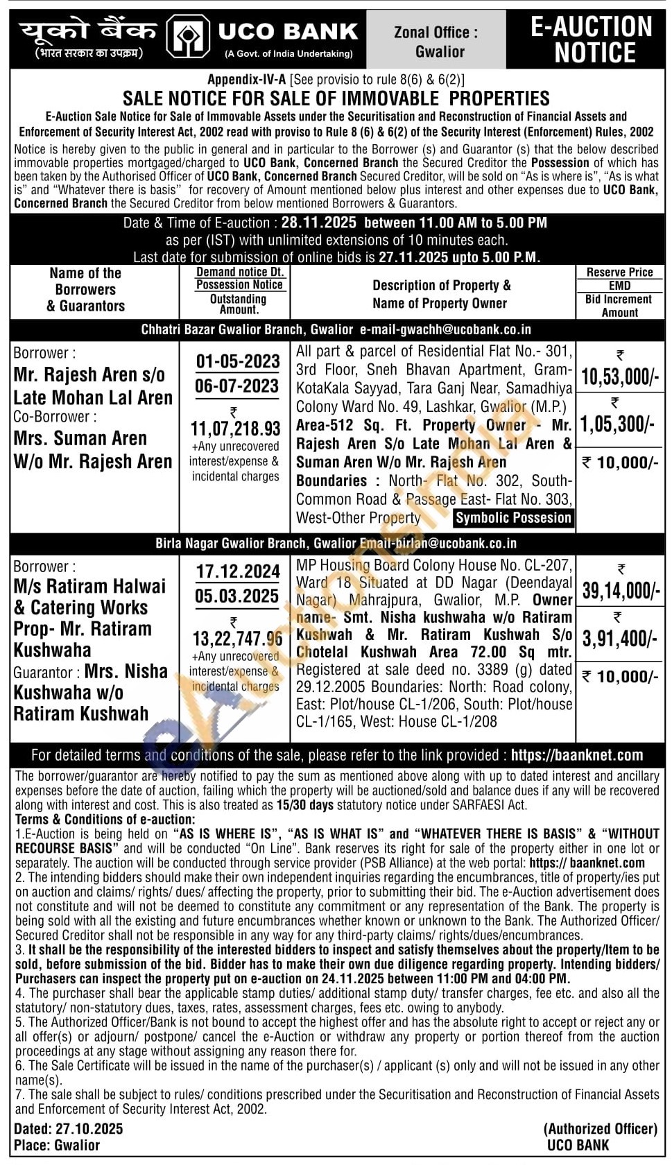2) MP Housing Board Colony House No. CL-207, Ward 18 Situated at DD Nagar (Deendayal Nagar) Mahrajpura, Gwalior, M.P. Owner name- Smt. Nisha kushwaha w/o Ratiram Kushwah & Mr. Ratiram Kushwah S/o Chotelal Kushwah Area 72.00 Sq mtr. Registered at sale deed no. 3389 (g) dated 29.12.2005 Boundaries: North: Road colony, East: Plot/house CL-1/206, South: Plot/house CL-1/165, West: House CL-1/208