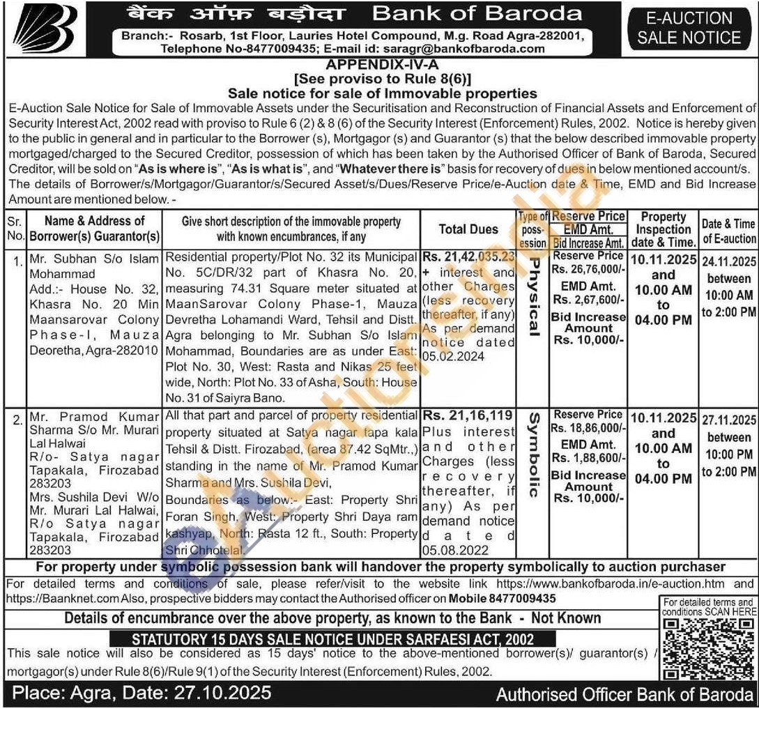 Residential property/Plot No. 32 its Municipal No. 5C/DR/32 part of Khasra No. 20. measuring 74.31 Square meter situated at MaanSarovar Colony Phase-1, Mauza Devretha Lohamandi Ward, Tehsil and Distt, Agra belonging to Mr. Subhan S/o Islam Mohammad, Boundaries are as under East: Plot No. 30, West: Rasta and Nikas 25 feet wide, North: Plot No. 33 of Asha, South: House No. 31 of Saiyra Bano.