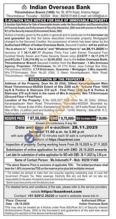 Door No 20 (Old), 3(New) Kavarapalayam Main Road Thiruninravur-602024 Extent of Site 2208 sq.ft. Ground Floor 1095 sq.ft & Portico & Staircase 210 sq.ft, First Floor 1230 sq.ft & Portico & Staircase 270 sq.ft Held in the name of Mrs.S.Jayanthi, W/o T.P.Srinivasan (Ground Floor + First Floor) Location of the Property: S.No 32/6,32/7,32/8, Door No 20 (Old), 3(New), Kavarapalayam Main Road Thiruninravur, Thiruvallur-602024. Bounded by: North by: House & site of Mrs. Kamalammal. South by: 20 ft wide Road, East by: Site of Mrs. J Lalitha Land and building number: 12/49, West by: Site of Mr. K.C. Subbrayalu Land and Building.