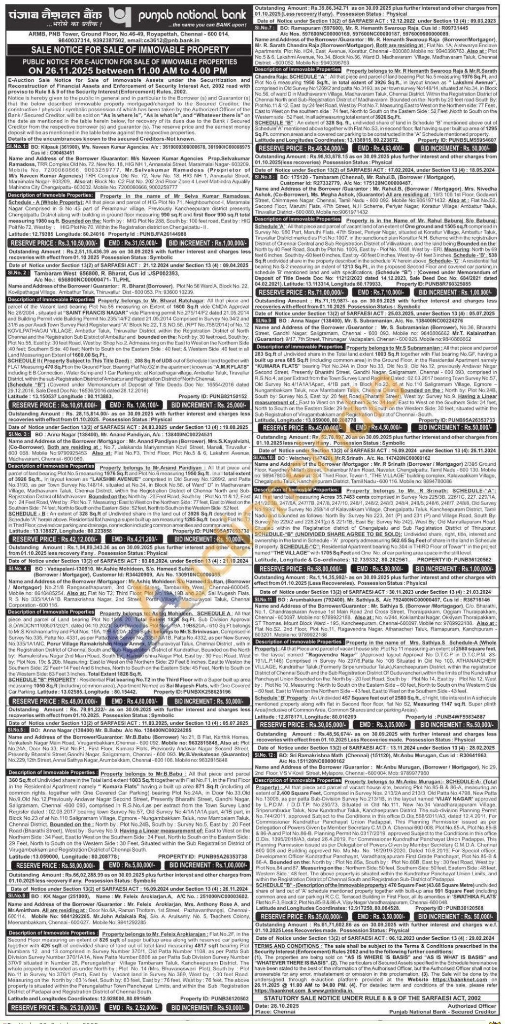 3) All that piece and parcel of land bearing Plot No.5 measuring 1976 Sq.ft and Plot No.6 measuring 1950 Sq.ft. In all total extent of 3926 Sq.ft., In layout known as "LAKSHMI AVENUE" comprised in Old Survey No. 1269/2, and Patta No.3193, as per Town Survey No. 148/14, situated at No.34, in Block No.56, of Ward" D" in Madhavaram Village, Madhavaram Taluk, Chennai District, within the Registration District of Chennai North and Sub-Registration District of Madhavaram. Bounded on the: North by: 20 Feet Road, South by Plot No. 11 & 12, East by: 24 Feet Road, West by: Plot No. 7. Measuring: East to West on the Northern Side: 77 feet, East to West on the Southern Side: 74 feet, North to South on the Eastern Side: 52 feet, North to South on the Westem Side: 52 feet. SCHEDULE-B: An extent of 328 Sq.ft of Undivided share in the land out of 3926 Sq.ft described in the Schedule "A" herein above. Residential flat having a super built up are measuring 1295 Sq.ft bearing Flat No. 13 in Third Floor, covered car parking and drainage, connection including common amenities and common area. Latitude: 13.138827, Longitude: 80.223858