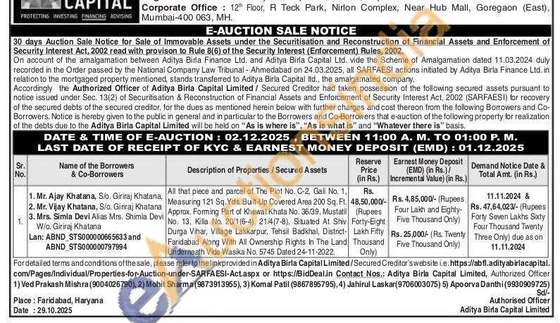 All that piece and parcel of The Plot No. C-2, Gali No. 1, Measuring 121 Sq. Yds. Built-Up Covered Area 200 Sq. Ft. Approx. Forming Part of Khewat Khata No. 36/39, Mustatil No. 13, Killa No. 20/1(6-4), 21/4(7-8), Situated At Shiv Durga Vihar, Village Lakkarpur, Tehsil Badkhal, District-Faridabad Along With All Ownership Rights In The Land Underneath Vide Wasika No. 5745 Dated 24-11-2022.