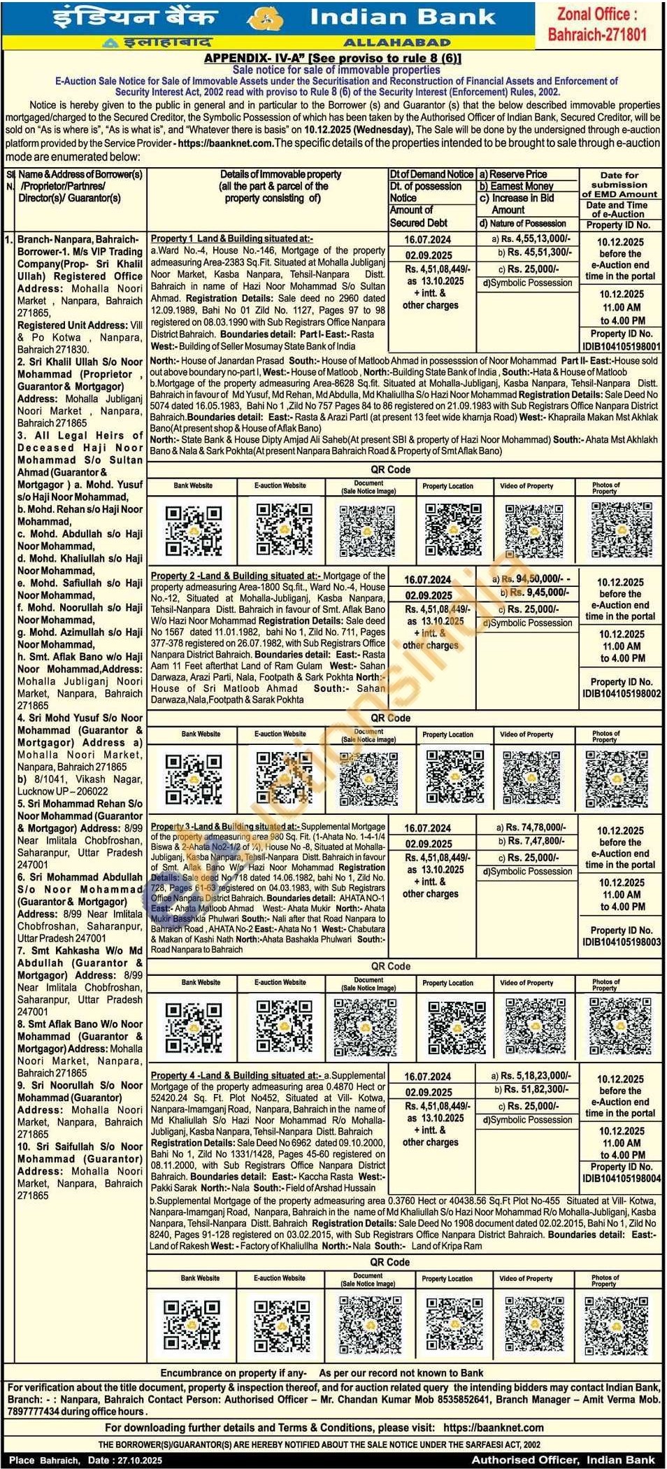 Property 2-Land & Building situated at: Mortgage of the property admeasuring Area-1800 Sq.fit., Ward No.-4, House No.-12, Situated at Mohalla-Jubliganj, Kasba Nanpara, Tehsil-Nanpara Distt. Bahraich in favour of Smt. Aflak Bano W/o Hazi Noor Mohammad Registration Details: Sale deed No 1567 dated 11.01.1982, bahi No 1, Zild No. 711, Pages 377-378 registered on 26.07.1982, with Sub Registrars Office Nanpara District Bahraich. Boundaries detail: East:- Rasta Aam 11 Feet afterthat Land of Ram Gulam West:- Sahan Darwaza, Arazi Parti, Nala, Footpath & Sark Pokhta North:-House of Sri Matloob Ahmad South: Sahan Darwaza, Nala, Footpath & Sarak Pokhta