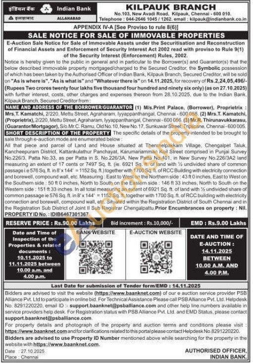 All that piece and parcel of Land and House situated at Thenmelpakkam Village, Chengalpet Taluk, Kancheepuram District, Kattankulathur Panchayat, Karumariamman Koil Street comprised in Punjai Survey No.226/3, Patta No.33, as per Patta in S. No. 226/3A, New Patta No 401, in New Survey No.226/3A2 land measuring an extent of 17 cents or 7497 Sq. ft. (ie. 6921 Sq. ft. of land with undivided share of common passage le 576 Sq. ft. in 8 x 144=1152 Sq. ft.) together with 1700 Sq. ft. of RCC Building with electricity connection and borewell, compound wall, etc. Measuring: East to West on the Northem side: 43 ft0 inches, East to West on the Southem side: 50 ft 0 inches, North to South on the Eastem side: 146 ft 33 inches, North to South on the Westem side: 151 ft 33 inches. In all total measuring an extent of 6921 Sq. ft. of land with ½ undivided share of common passage ie 576 Sq. ft. in 8'x 1441152 Sq. ft. together with 1700 Sq. ft. of RCC building with electricity connection and borewell, compound wall, etc. Situated within the Registration District of South Chennai and in the Registration Sub District of Joint II Sub Registrar Chengalpattu Prior Encumbrances on property: Nil. PROPERTY ID No.: IDIB6467301367