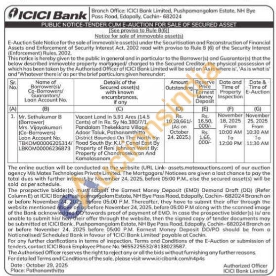 Vacant Land in 5.91 Ares (14.5 Cents) of in Re. Sy No.380/7/1. Pandalam Thekekkara Village. Adoor Taluk, Pathanamthitta District Bounded On The: North By: Road South By: KI.P Canal East By Property of Reni Johnson West By: Property of Chandrasekaran And Kamalasanam