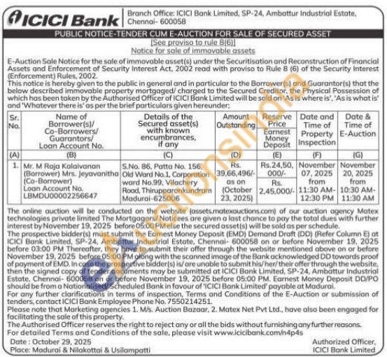 S.No. 86. Patta No. 156, Old Ward No. 1. Corporation ward No.99, Vilachery Road, Thirupparankundram Madurai-625006