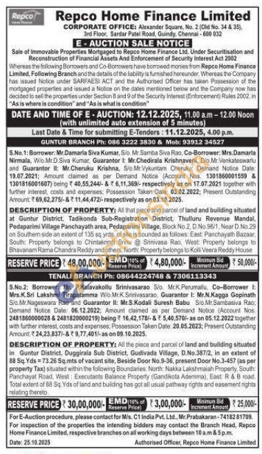 DESCRIPTION OF PROPERTY: All the piece and parcel of land and building situated in Guntur District, Duggirala Sub District, Gudivada Village, D.No.387/2, in an extent of 88 Sq. Yds 73.26 Sq.mts of vacant site, Beside Door No.9-36, present Door No.3-457 (as per property Tax) situated within the following Boundaries: North: Nakka Lakshmalah Property, South Panchayat Road, West: Executants Balance Property (Gandikota Ademma), East: R & B road Total extent of 88 Sq Yds of land and building has got all usual pathway rights and easement rights relating thereto.
