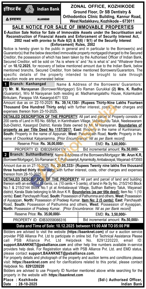 DETAILED DESCRIPTION OF THE PROPERTY: All part and parcel of land and building thereon with an extent of 15 cents, i.e. (10 cents + 5 cents), of land in Re Sy No. 215/2143 Block No.1 & 215/2144 Block No.1 pt at Ambalavayal Village, Sulthan Bathery Taluk, Wayanad district, Kerala State belonging to Mr.Arun K R. Boundaries (as per title deed): Item No: 1 (10 cents): East: Panchayath Road, South: Possession of Pathumma and others, West: Possession of Ayyappan, North: Possession of Pradeep Kumar. Item No: 2 (5 cents): East: Panchayath Road, South: Possession of Pathumma and others, West: Possession of Ayyappan, North: Possession of Pradeep Kumar. [Prior Encumbrance: Nil as per Bank record