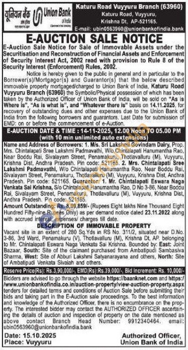 Vacant site in an extent of 280 Sq. Yds in RS No. 311/2, situated near D. No. 3-86, 3rd Ward, Penamakuru (V), Thotlavalluru (M), Krishna Dt. AP. belonging to Mr. Chintalapati Eswara Naga Venkata Sai Krishna. Bounded by: East: Joint Bazaar, South: Site of the claimant purchased from Ambatipudi Sambasiva Sharma, West: Site of Abburi Lakshmi Satyanarayana and others, North: Site of Ambatipudi Venkata Sivaiah and others.