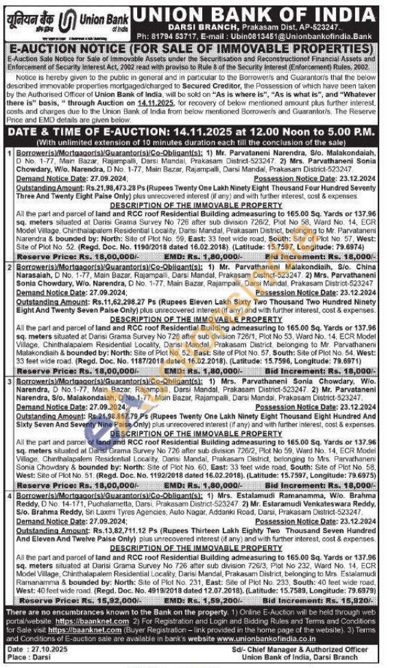 All the part and parcel of land and RCC roof Residential Building admeasuring to 165.00 Sq. Yards or 137.96 sq. meters situated at Darisi Grama Survey No 726 after sub division 726/1, Plot No 53, Ward No. 14, ECR Model Village, Chinthalapalem Residential Locality, Darisi Mandal, Prakasam District, belonging to Mr. Parvathaneni Malakondiaih & bounded by: North: Site of Plot No. 52, East: Site of Plot No. 57, South: Site of Plot No. 54, West: 33 feet wide road. (Regd. Doc. No. 1187/2018 dated 16.02.2018). (Latitude: 15.7596, Longitude: 79.6971)