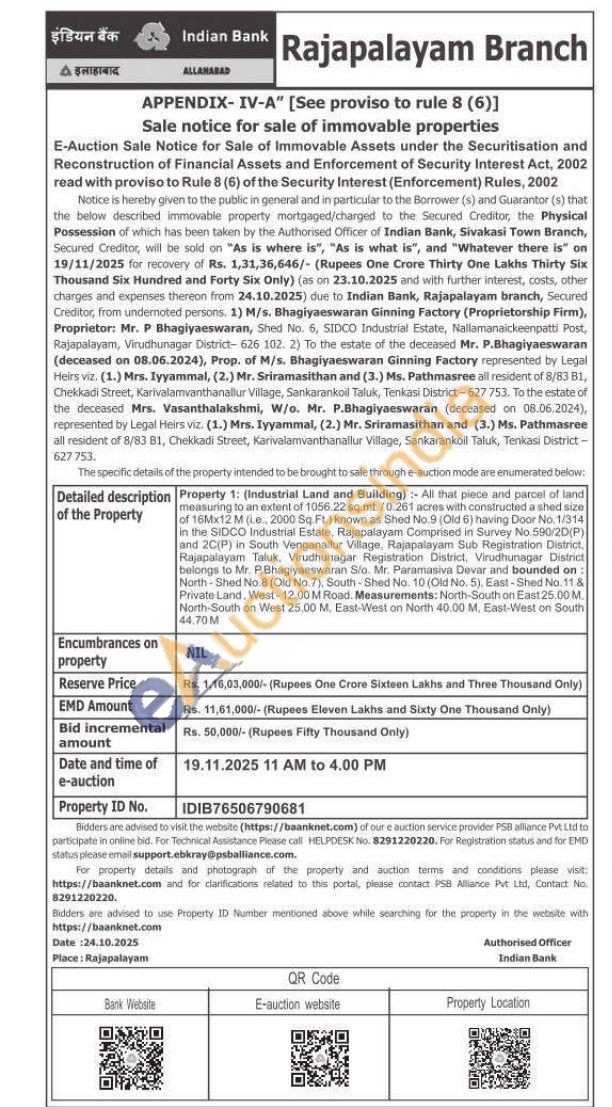 All that piece and parcel of tand measuring to an extent of 1056.22 sq.mt/0.261 acres with constructed a shed size of 16Mx12 M (ie, 2000 Sq Ft.) known as Shed No.9 (Old 6) having Door No. 1/314 in the SIDCO Industrial Estate, Rajapalayam Comprised in Survey No. 590/2D(P) and 2C(P) in South Venganallur Village, Rajapalayam Sub Registration District, Rajapalayam Taluk, Virudhunagar Registration District, Virudhunagar District belongs to Mr. P. Bhagiyaeswaran Sio. Mr. Paramasiva Devar and bounded on: North Shed No.8 (Old No.7), South-Shed No. 10 (Old No. 5) East-Shed No. 11 & Private Land, West-12.00 M Road. Measurements: North-South on East 25.00 м. North-South on West 25.00 M. East-West on North 40.00 M. East-West on South 44.70 M