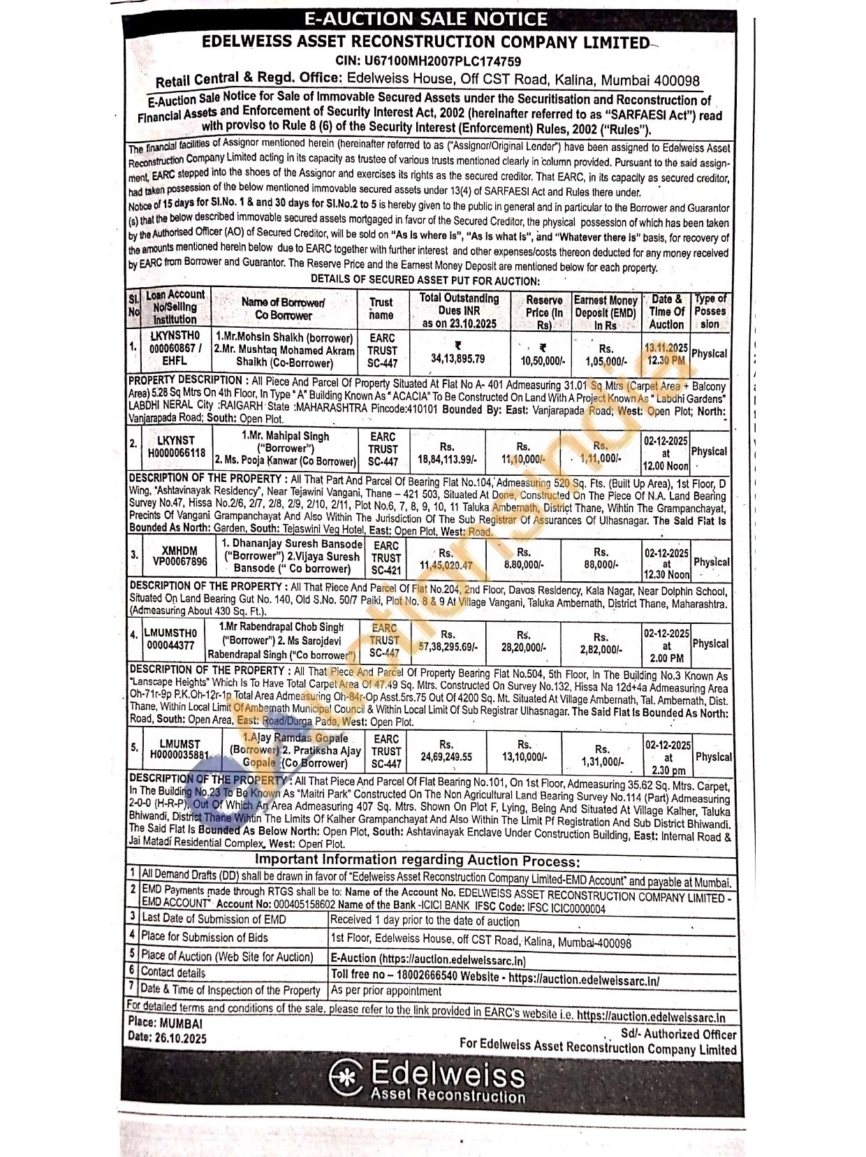 DESCRIPTION OF THE PROPERTY: All That Piece And Parcel Of Property Bearing Flat No.504, 5th Floor, In The Building No.3 Known As "Lanscape Heights" Which Is To Have Total Carpet Area Of 47.49 Sq. Mtrs. Constructed On Survey No.132, Hissa Na 12d+4a Admeasuring Area Oh-71r-9p P.K.Oh-12r-1p Total Area Admeasuring Oh-84r-Op Asst. 5rs.75 Out Of 4200 Sq. Mt. Situated At Village Ambernath, Tal. Ambernath, Dist. Thane, Within Local Limit Of Ambernath Municipal Council & Within Local Limit Of Sub Registrar Ulhasnagar. The Said Flat Is Bounded As North: Road, South: Open Area, East: Road/Durga Pada, West: Open Plot.