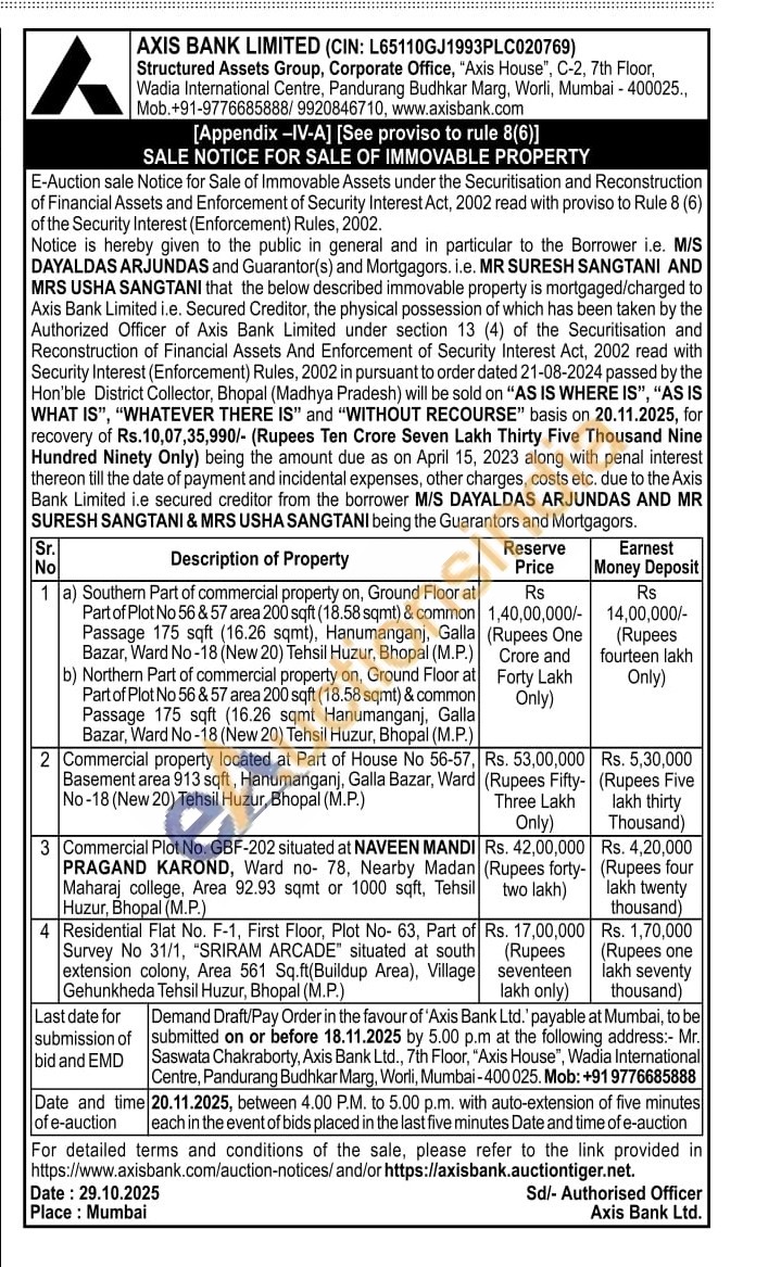 b) Northern Part of commercial property on, Ground Floor at Part of Plot No 56 & 57 area 200 sqft (18.58 sqmt) & common Passage 175 sqft (16.26 sqmt Hanumanganj, Galla Bazar, Ward No-18 (New 20) Tehsil Huzur, Bhopal (M.P.)