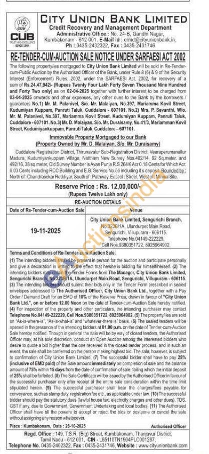 Cuddalore Registration District, Thirunavalur Sub-Registration District, Veeraperumanallur Madura, Kudumiyankuppam Village, Nattham New Survey Nos. 492/14, 92 Sq.meter and 492/16, 38 sq meter, Old Survey Number is Ayan Punja R.S 264/6 Acr 0.18 Cents for Which Acr 0.03 Cents including RCC Building and E.B. Service No. 56 including its deposit. Bounded by North of: Chandrasekar Reddiyar, South of Pathway, East of: Street, West of Minnal Site