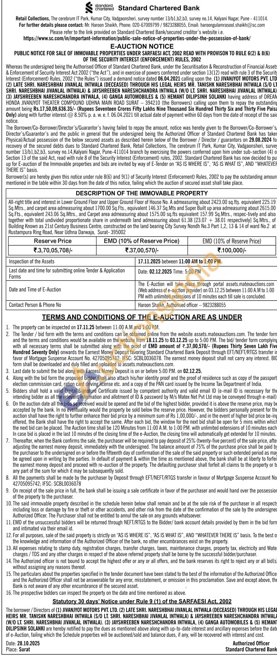 All-right title and interest in Lower Ground Floor and Upper Ground Floor of House No. A admeasuring about 2423.00 sq.fts. equivalent 225.19 Sq.Mtrs., and carpet area admeasuring about 1700.00 Sq. Fts., equivalent 146.37 Sq.Mts and Super Built up area admeasuring about 2615.00 Sq.Fts., equivalent 243.06 Sq.Mtrs., and Carpet area admeasuring about 1575.00 sq.fts equivalent 157.99 Sq.Mtrs., respec-tively and also together with total undivided proportionate share in underneath land admeasuring about 61.38 [23.07 + 38.01 respectively] Sq.Mtrs., of Building Known as 21st Century Business Centre, constructed on the land bearing City Survey Nondh No.3 Part 1,2, 13 & 14 of ward No.2 at Rustampura Ring Road, Near Udhna Darwaja, Surat-395002