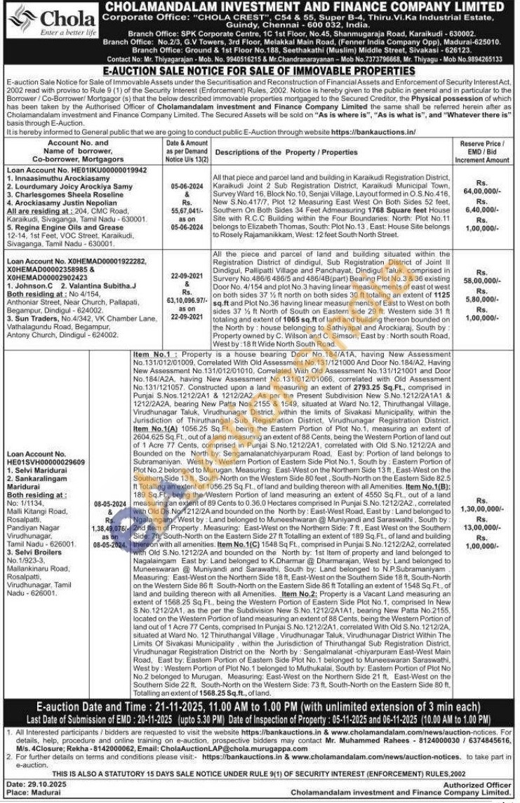 Item No.1 Property is a house bearing Door No. 184/A1A, having New Assessment No. 131/012/01009, Correlated With Old Assessment No. 131/121000 And Door No. 184/A2, Having New Assessment No. 131/012/01010, Correlated With Old Assessment No. 131/121001 and Door No.184/A2A, having New Assessment No. 131/012/01066, correlated with Old Assessment No. 131/121057. Constructed upon a land measuring an extent of 2793.25 Sq.Ft., comprised in Punjai S.Nos. 1212/2A1 & 1212/2A2, As per the Present Subdivision New S.No. 1212/2A1A1 & 1212/2A2A, bearing New Patta Nos 2155 & 1549, situated at Ward No.12, Thiruthangal Village, Virudhunagar Taluk, Virudhunagar District, within the limits of Sivakasi Municipality, within the Jurisdiction of Thiruthangal Sub Registration District, Virudhunagar Registration District. Item No.1(A) 1056.25 Sq.Ft., being the Eastern Portion of Plot No.1, measuring an extent of 2604.625 Sq.Ft., out of a land measuring an extent of 88 Cents, being the Western Portion of land out of 1 Acre 77 Cents, comprised in Punjai S.No. 1212/2A1, correlated with Old S.No. 1212/2A and Bounded on the North by: Sengamalanatchiyarpuram Road, East by: Portion of land belongs to Subramaniyan. West by: Western Portion of Eastern Side Plot No. 1, South by: Eastern Portion of Plot No.2 belonged to Murugan. Measuring: East-West on the Northern Side 13ft, East-West on the Southern Side 13ft, South-North on the Western Side 80 feet, South-North on the Eastern Side 82.5 ft Totalling an extent of 1056.25 Sq.Ft., of land and building thereon with all Amenities. Item No.1(B): 189 Sq.Ft., being the Western Portion of land measuring an extent of 4550 Sq.Ft., out of a land measuring an extent of 89 Cents to 0.36.0 Hectares comprised in Punjai S.No. 1212/2A2, correlated with Old Ds.No. 1212/2A and bounded on the North by: East-West Road, East by: Land belonged to Ngalaingam, West by: Land belonged to Muneeshwaran @ Muniyandi and Saraswathi, South by: - 2nd Item of Property. Measuring: East-West on the Northern Side: 7 ft, East West on the Southern Side: 7ft, South-North on the Eastern Side 27 ft Totalling an extent of 189 Sq. FL., of land and building thereon with all amenities. Item No.1(C) 1548 Sq Ft., comprised in Punjai S.No. 1212/2A2, correlated with Old S.No.1212/2A and bounded on the North by: 1st Item of property and land belonged to Nagalaingam East by: Land belonged to K.Dharmar @ Dharmarajan, West by: Land belonged to Muneeswaran @ Muniyandi and Sarawathi, South by: Land belonged to N.P.Subramaniyam Measuring: East-West on the Northern Side 18 ft, East-West on the Southern Side 18 ft, South-North on the Western Side 86 ft South-North on the Eastern Side 86 ft Totalling an extent of 1548 Sq. Ft, of land and building thereon with all Amenities. Item No.2: Property is a Vacant Land measuring an extent of 1568.25 Sq.Ft., being the Western Portion of Eastern Side Plot No. 1, comprised In New S.No.1212/2A1, as the per the Subdivision New S.No. 1212/2A1A1, bearing New Patta No.2155, located on the Western Portion of land measuring an extent of 88 Cents, being the Western Portion of land out of 1 Acre 77 Cents, comprised In Punjai S.No. 1212/2A1, correlated With Old S.No. 1212/24, situated at Ward No. 12 Thiruthangal Village, Virudhunagar Taluk, Virudhunagar District Within The Limits Of Sivakasi Municipality, within the Jurisdiction of Thiruthangal Sub Registration District, Virudhunagar Registration District on the North by: Sengalmalanat-chiyarpuram East-West Main Road, East by, Eastem Portion of Eastern Side Plot No.1 belonged to Muneeswaran Saraswathi, West by: Western Portion of Plot No. 1 belonged to Muthukalai, South by: Eastern Portion of Plot No No.2 belonged to Murugan, Measuring: East-West on the Northern Side 21 ft, East-West on the Southern Side 22 ft. South-North on the Western Side: 73 ft. South-North on the Eastern Side 80 ft. Totalling an extent of 1568.25 Sq.ft., of land