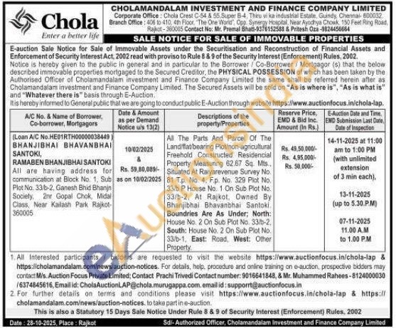 All The Parts And Parcel Of The Landiflat/bearing Plot/non-agricultural Freehold Constructed Residencial Property Measuring 62.67 Sq. Mts.. Situated At Raiyarevenue Survey No 81 Tp. No 4. Fp. No. 329 Plot No. 33/b P House No. 1 On Sub Plot No. 33/b-2, At Rajkot, Owned By Bhanjibhai Bhavanbhal Santoki Boundries Are As Under; North: House No. 2 On Sub Plot No. 33/b-2, South: House No. 2 On Sub Plot No. 33/b-1, East: Road, West: Other Property