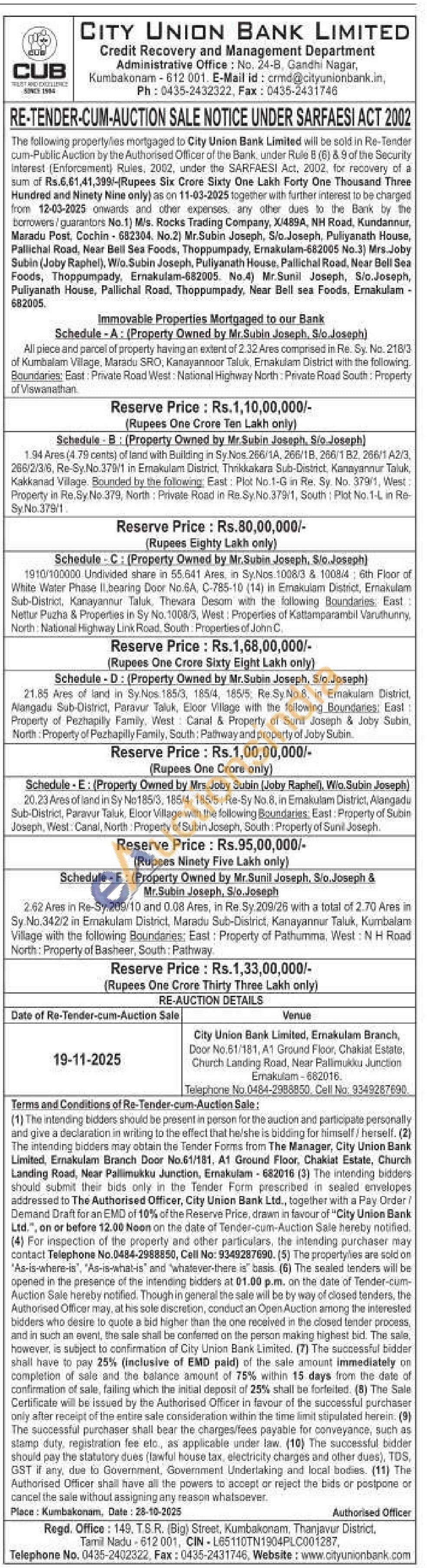 1) All piece and parcel of property having an extent of 2.32 Ares comprised in Re. Sy. No. 218/3 of Kumbalam Village, Maradu SRO, Kanayannoor Taluk, Ernakulam District with the following. Boundaries: East: Private Road West: National Highway North: Private Road South: Property of Viswanathan