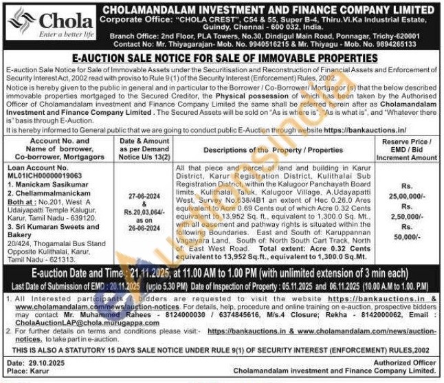 All that plece and parcel of land and building in Karur District, Karur Registration District, Kulithalai Sub Registration District, within the Kalugoor Panchayath Board limits, Kulithalal Taluk, Kalugoor Village, A. Udayapatti West, Survey No.638/481 an extent of Hec 0.26.0 Ares equivalent to Acre 0.69 Cents out of which Acre 0,32 Cents equivalent to 13.952 Sq. ft., equivalent to 1,300.0 Sq. Mt. with all easement and pathway rights is situated within the following Boundaries. East and South of Karuppannan Vagaiyara Land, South of North South Cart Track, North of East West Road. Total extent: Acre 0.32 Cents equivalent to 13,952 Sq.ft., equivalent to 1,300.0 Sq.Mt