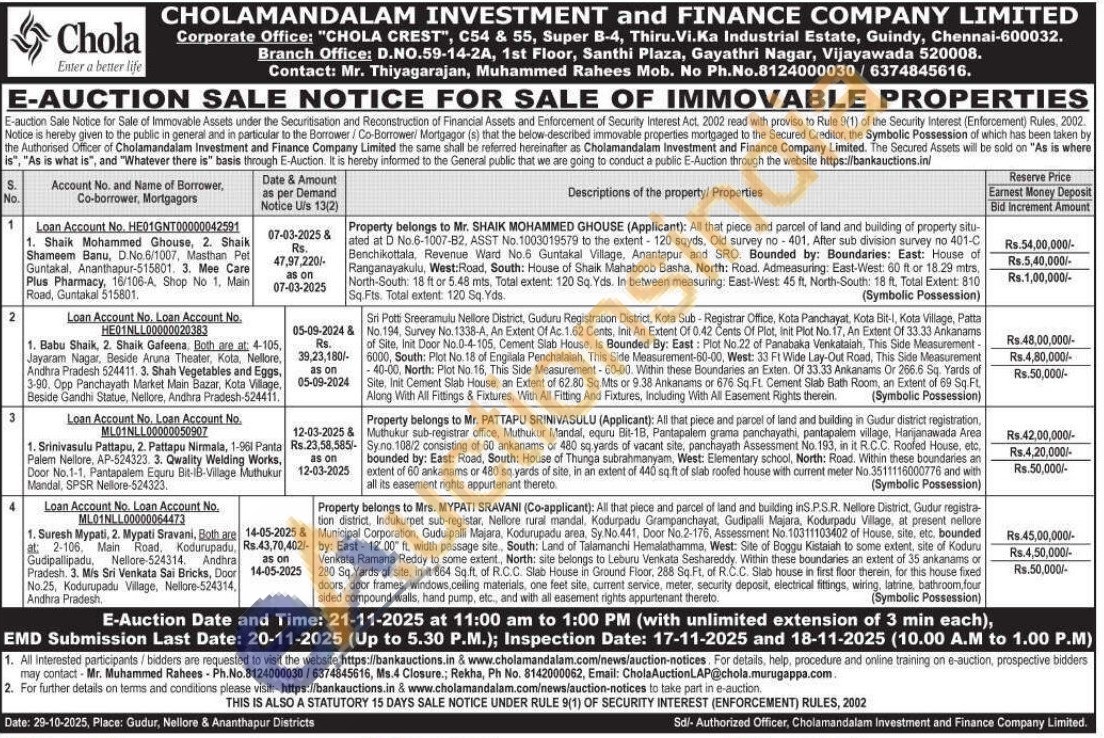 Property belongs to Mr. SHAIK MOHAMMED GHOUSE (Applicant): All that piece and parcel of land and building of property situ ated at D No.6-1007-82, ASST No.1003019579 to the extent-120 sqyds, Old survey no-401, After sub division survey no 401-C Benchikottala, Revenue Ward No.6 Guntakal Village, Anantapur and SRO. Bounded by: Boundaries: East: House of Ranganayakulu, West:Road, South: House of Shaik Mahaboob Basha, North: Road. Admeasuring: East-West: 60 ft or 18.29 mtrs. North-South: 18 ft or 5.48 mts, Total extent: 120 Sq. Yds. In between measuring: East-West 45 ft, North-South: 18 ft. Total Extent: 810 Sq. Fts. Total extent: 120 Sq. Yds