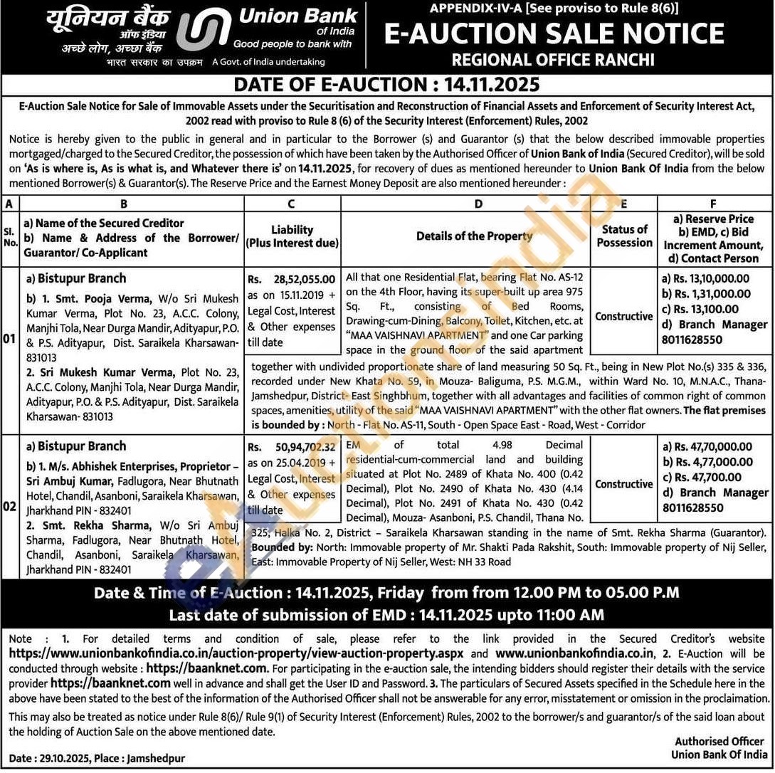 All that one Residential Flat, bearing Flat No. AS-12 on the 4th Floor, having its super-built up area 975 of Bed Rooms, consisting Sq. Ft. Drawing-cum-Dining, Balcony, Toilet, Kitchen, etc. at "MAA VAISHNAVI APARTMENT" and one Car parking space in the ground floor of the said apartmenttogether with undivided proportionate share of land measuring 50 Sq. Ft., being in New Plot No.(s) 335 & 336, recorded under New Khata No. 59, in Mouza- Baliguma, P.S. M.G.M., within Ward No. 10, M.N.A.C., Thana-Jamshedpur, District- East Singhbhum, together with all advantages and facilities of common right of common spaces, amenities, utility of the said "MAA VAISHNAVI APARTMENT" with the other flat owners. The flat premises is bounded by: North - Flat No. AS-11, South - Open Space East - Road, West - Corridor
